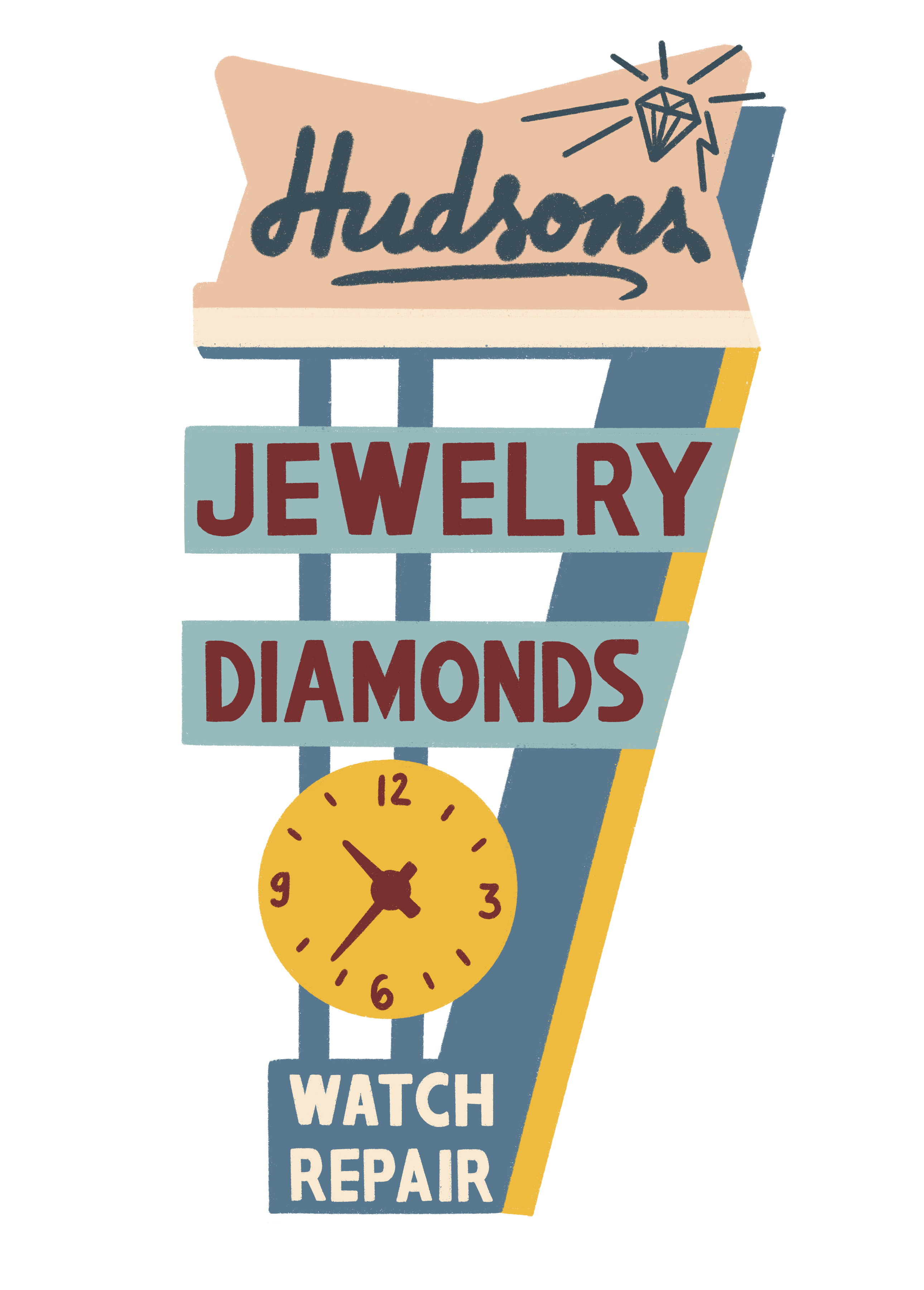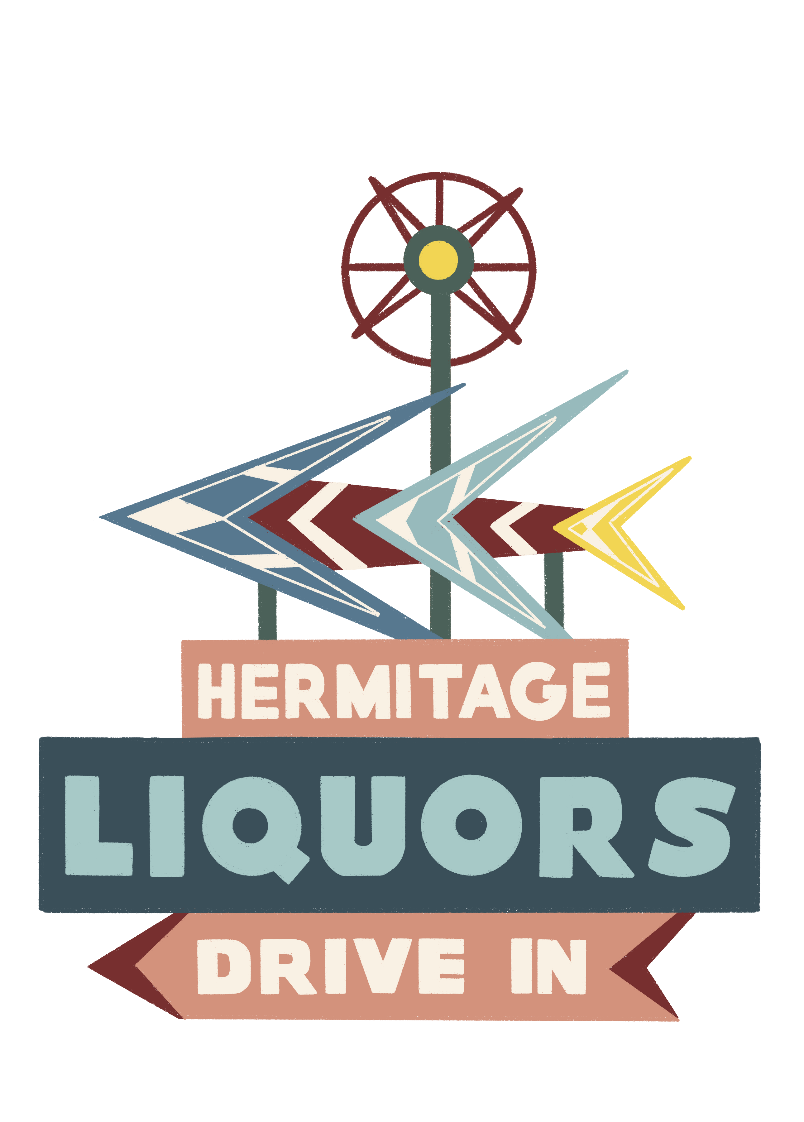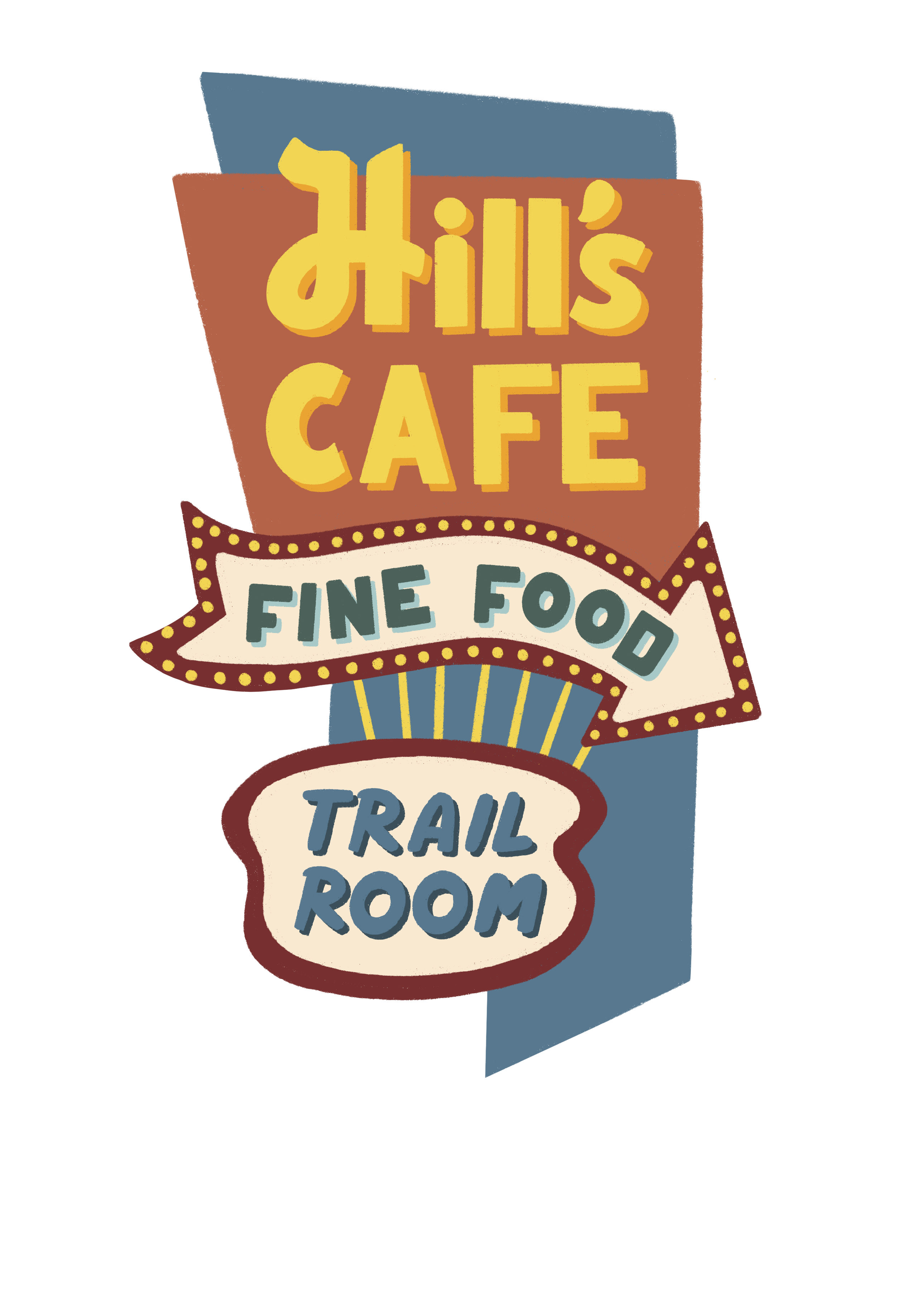 A nostalgic illustration series that captures the bold charm and quirky elegance of American shop signs of a bygone era. From roadside fish fry joints to liquor drive-ins and cheerful retail slogans, each piece recreates a slice of commercial history through stylized shapes and retro palettes.